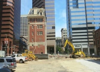 Crews have taken down a row of retail buildings along Baltimore Street and are now preparing the north side of the property to erect a crane. The replacement building will be constructed around the historic Thomas building at Baltimore and Light streets, which is not part of the development site. Metropolitan Partnership and Madison Marquette are the developers. URS/AECOM is the lead designer, and Donohoe is the construction manager.