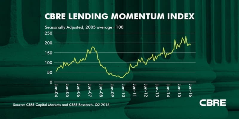 The CBRE Lending Momentum Index, which tracks the pace of U.S. commercial loan closings, increased by 2.1 percent in Q2 2016. The Index shows positive momentum on a year-over-year basis, with loan closings up by 5.7 percent.