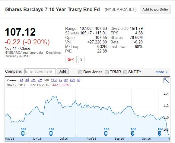 I think we are already feeling the effects of a Donald Trump presidency in the bond market. The long-term US Treasury ETF (NYSEARCA:IEF) tells the story about how the bond market woke up after the "upset" election.