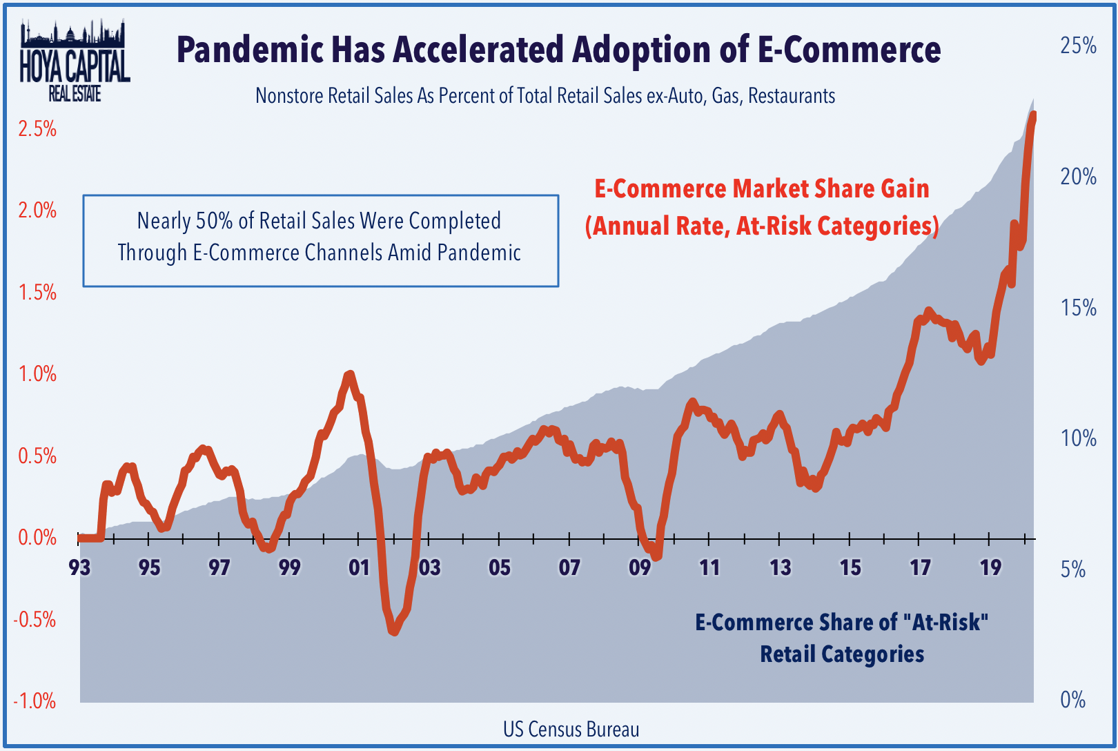 Apocalypse Now? Entering 2020 on already unstable footing following a tsunami of store closings over the past half-decade, mall REITs have been punished by the ongoing coronavirus pandemic, plunging nearly 50% in 2020. Within the Hoya Capital Mall REIT Index, we track the seven mall REITs, which account for roughly $25 billion in market value: Simon Property Group (SPG), Taubman Centers (TCO.PK), Macerich Co. (MAC), Tanger Factory Outlet Centers (SKT), Washington Prime Group (WPG), Pennsylvania Real Estate Investment Trust (PEI), and CBL & Associates Properties (CBL), as well as one diversified REIT, Brookfield Property REIT (BPYU), which owns a portfolio comprised of roughly 50% mall properties.