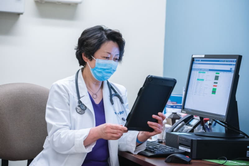 Dr. Ming Yi conducts a telehealth appointment with a Charlestown resident from the community’s on-site medical center, which provides convenient, coordinated care to help residents live healthier lives