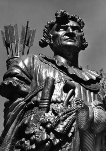 Tecumseh, Naval Academy (1940) - (Image ID 08-089) - THE GOD OF 2.5 … This bronze replica of the U.S.S. Delaware’s figurehead is Tecumseh, the god of 2.5, the Academy’s passing grade. Perfect is 4.0. Pennies are tossed at him to gain his help in getting better grades or other boons such as a lovely drag (girl) for one of the hops (dances). Although dubbed "Tecumseh" by the Middies it is really "Tamenend", according to a Loyola professor.