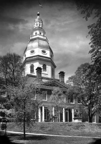 State House, Annapolis (1962) - (Image ID 08-019) - It is the oldest state capitol in the nation still used for legislative purposes; it was begun in 1772. Two others had preceded it on the site. Its white-painted dome is 116 feet high. The statue at the entrance is of Roger Brooke Taney, a chief justice of the United States.