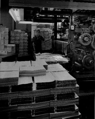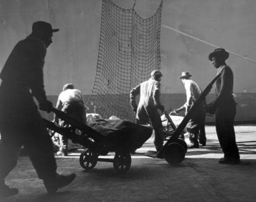 Stevedores (1955) - (Image ID 29-194) - The men here unloading rubber from a ship are really longshoremen; the stevedore is the supplier of such workers. But landlubbers have always confused the two terms. In Baltimore three-fourths of the 3,400 longshoremen are Negroes. This force has an international reputation for efficiency, speed and reliability and for being free from corruption. This photograph was accepted 46 times in Salon Competition. It won medals in Russia, Yugoslavia (twice) and Romania. This photograph appeared in The Face of Maryland, by A. Aubrey Bodine, published by Bodine & Associates.