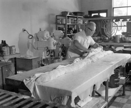 Apple Strudel (1959) - By means of the table cloth, the strudel is pushed across the board forming one long roll. This is cut into sections for baking.
