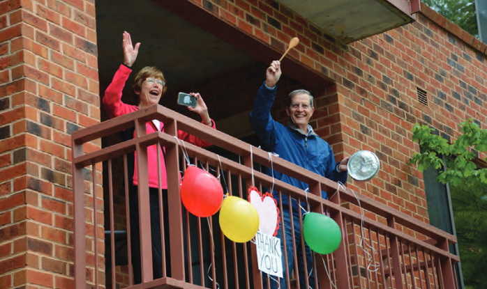 Longtime Parkville residents John and Susan Hart have enjoyed living at Oak Crest since 2018. Shown here celebrating Resident/Staff Appreciation Day from their balcony in May 2020