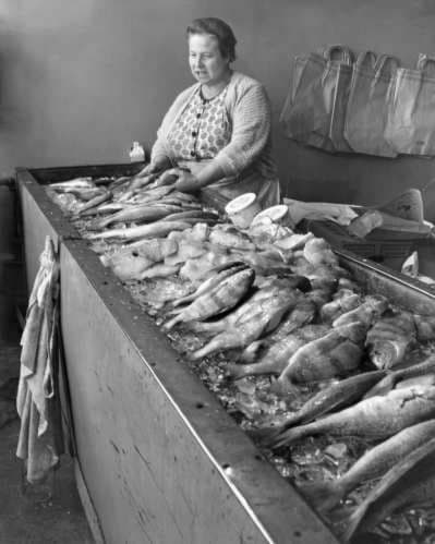 Lombard Street: Jew Town (1969) - Mrs. Samuel (Dora) Aquia places fresh fish on ice in her husband's seafood market. East Lombard Street initially catered to people who worked six days a week and Sunday became its busiest day. This has never changed over the years.