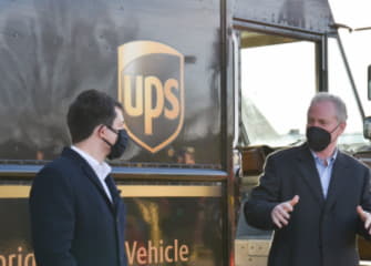 U.S. Transportation Secretary Pete Buttigieg, left, and Sen. Chris Van Hollen toured a UPS facility in Landover Monday that is delivering vaccines to Maryland and D.C. They met with UPS drivers who are delivering vaccines and saw demonstrations of how the